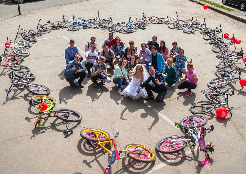 3 июня по Ижевску прокатился необычный кортеж из 30 велосипедов! Это была свадьба фанатов велоспорта Юлии и Евгения Дресвянниковых. Ребята не представляют свою жизнь без велосипедов – передвигаются на них по городу и участвуют в соревнованиях по даунхиллу (скоростной спуск с горы). Идея свадьбы пришла им в голову уже давно. Сначала влюбленные планировали расписаться во всей своей экипировке – костюме, наколенниках и шлеме. Вот только родители были против и убедили молодоженов прийти в ЗАГС нарядными. А друзья с восторгом приняли идею приехать на торжество не на такси.