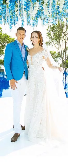 – Свадьба была выездная, фуршетного формата, с музыкантами, саксофоном. Никаких выкупов, тамады и конкурсов. Цвета выбирали под морской стиль – белый и голубой. Для торжества покупала два платья: основное и более легкое. А еще мы летали на вертолете, так как в Крыму летом все в пробках, мы просто заменили вертолетом машину. Свадьбу организовали за 3 недели.