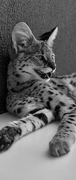 5-месячный сервал весит уже 7 килограммов и продолжает расти дальше – взрослые особи достигают от 90 до 135 сантиметров в длину и весят до 18 кг. Кормят его мясом 2-3 раза в день. Кстати, взрослые коты его вида съедают до двух килограммов мяса в день!