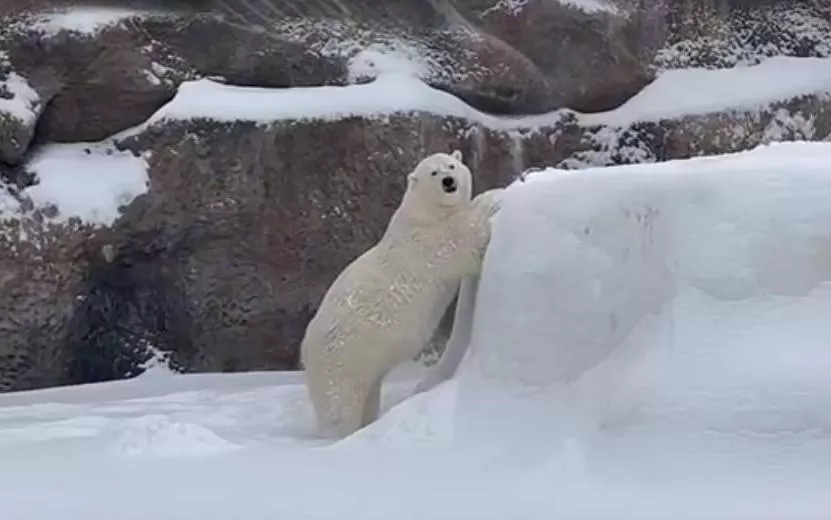 Так, пресс-служба учреждения поделилась видео, на котором запечатлена белая медведица Думка, играющая в своем заснеженном вольере.