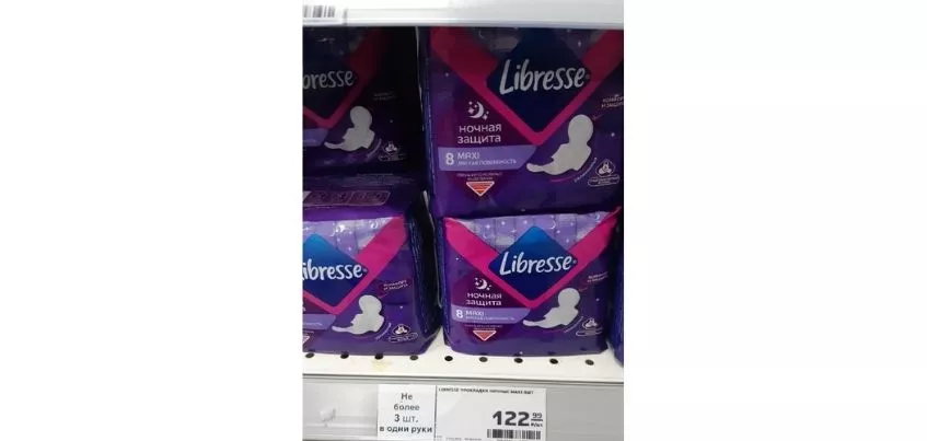 Читательница IZHLIFE прислала нам фотографию, где на ценнике на прокладки указано, что товар будут продавать не более трех упаковок в одни руки.