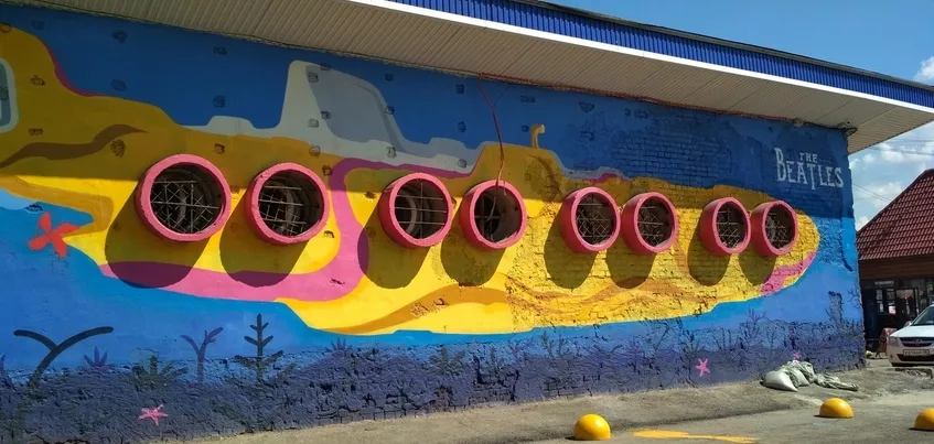 На стене одного из технических помещений в районе Центрального рынка столицы Удмуртии появилось необычное граффити. Художники изобразили здесь героиню песни легендарной рок-группы The Beatles («Битлз») – Желтую подводную лодку.