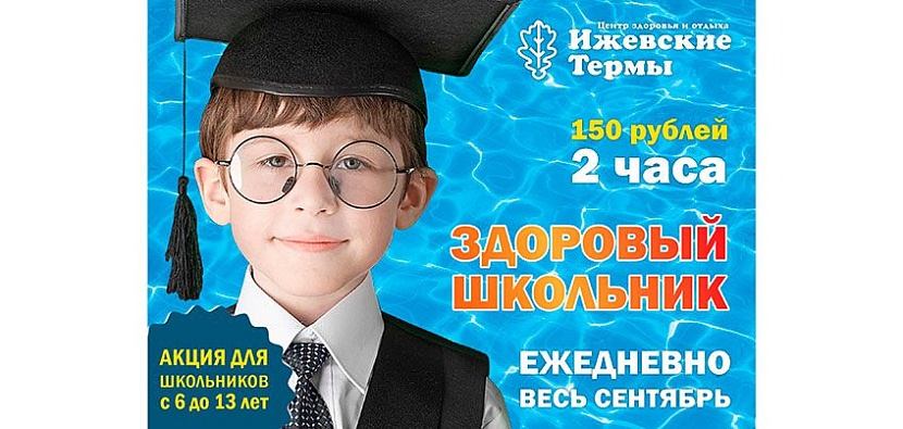 – Детям на протяжении всего учебного года требуется много сил и крепкое здоровье, чтобы хорошо учиться и активно участвовать в школьных мероприятиях. Поэтому, мы создали выгодные условия для отдыха и подготовки организма школьника к учебной нагрузке! Акция действует в будни с 06:00 до 22:00 и в выходные с 10:00 до 22:00, – прокомментировали в Центре здоровья и отдыха «Ижевские термы».