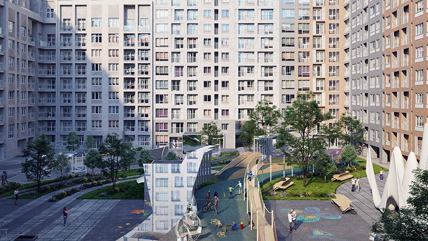 Здесь есть площадки для воркаута, велодорожки, детские городки с мягким покрытием, разнообразный рельеф, напоминающий природный ландшафт. Двор приглянется и детям, и их родителям, и людям преклонного возраста. Полностью закрытый с трех сторон, не предназначенный для машин, он безопасен для детей - ребенка можно отпустить погулять одного и быть спокойным за него.