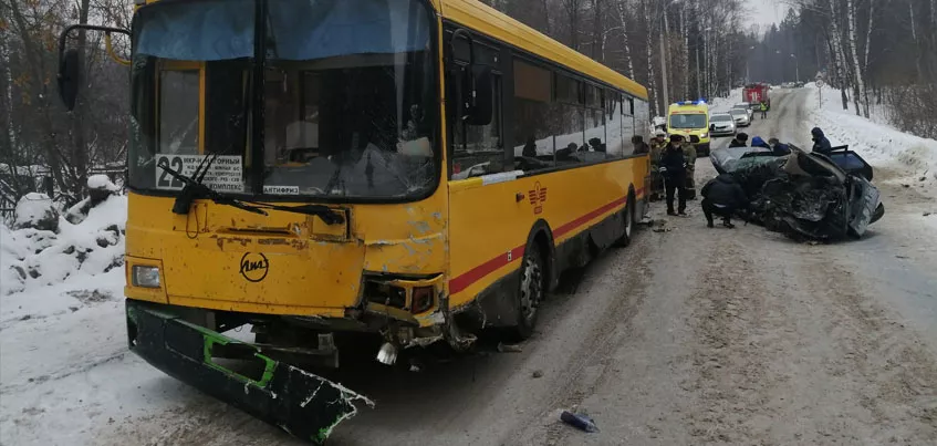 В результате ДТП женщина – водитель легковушки – скончалась на месте, а водитель автобуса госпитализирован с травмами. По предварительным данным, в салоне автобуса находились 10 пассажиров, но пострадавших среди них нет.