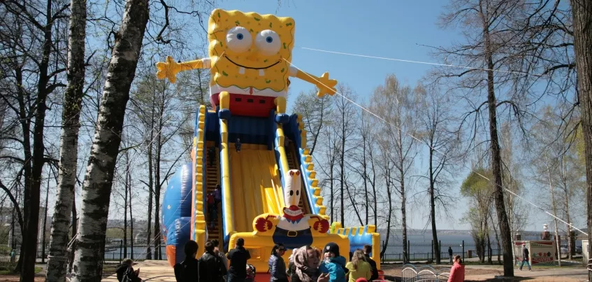 Первое, что встретило горожан на входе, - огромный, высотой 15 метров, батут в виде героя мультфильма «Губка Боб». Он установлен на месте старой сцены, неподалеку от ротонды - не заметить его невозможно.