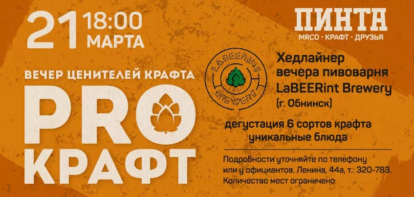 21 марта в 18:00 в Пите на Ленина, 44А ждем всех ценителей качественного крафта! Амбассадор вечера – LaBEERint Brewery, город Обнинск.