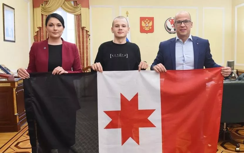 Глава Удмуртии Александр Бречалов вручил юноше флаг республики, который он сможет водрузить на полюсе.