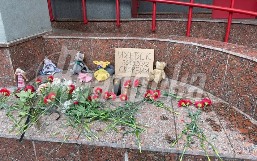 Как сообщает Readovka, жители несут цветы и детские игрушки. Рядом лежит небольшая картонка с надписью: «Ижевск. 26.09.2022. Скорбим».